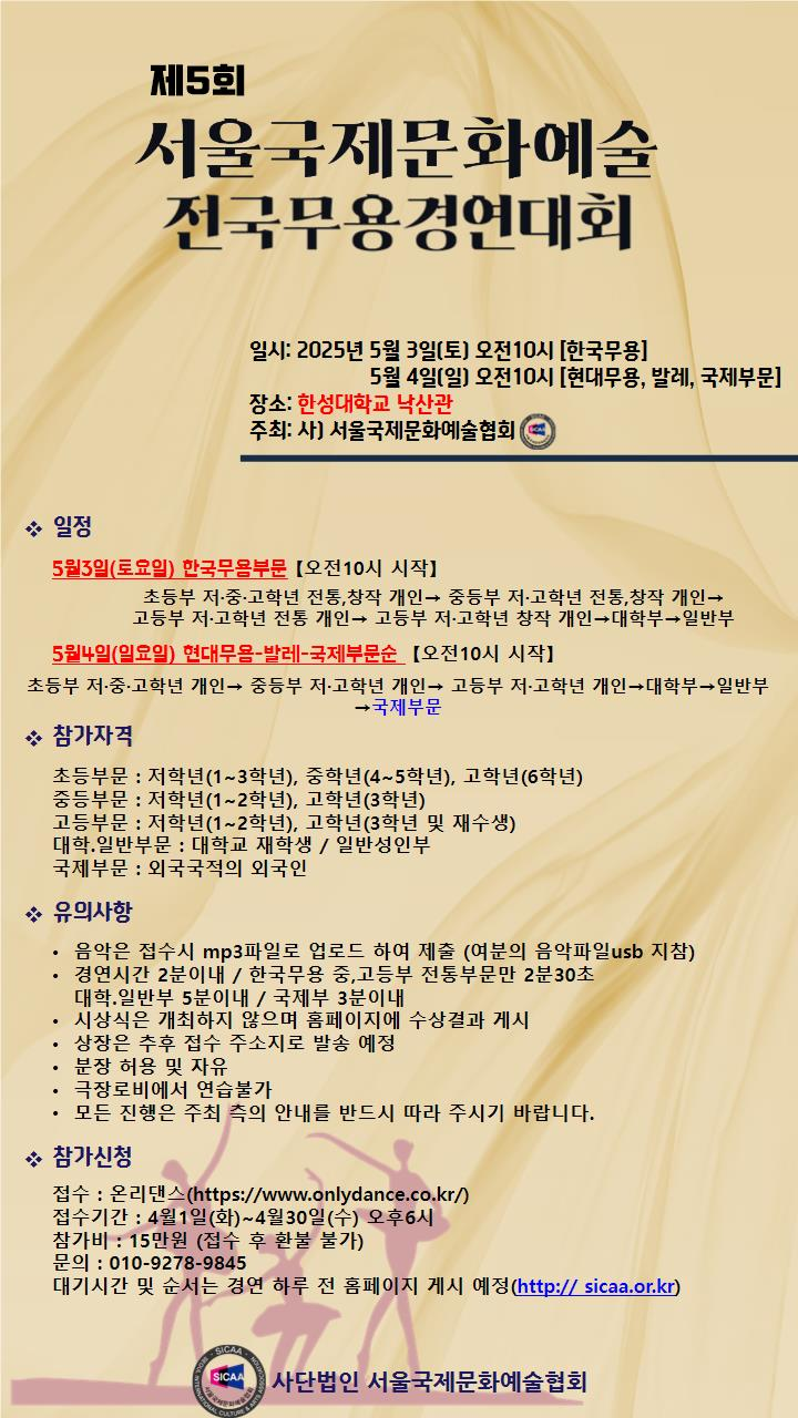 (사)서울국제문화예술협회 05372 서울특별시 강동구 양재대로 1384, 3층 2호 (둔촌동) / 고유번호 351-82-00388 이사장 백현순
